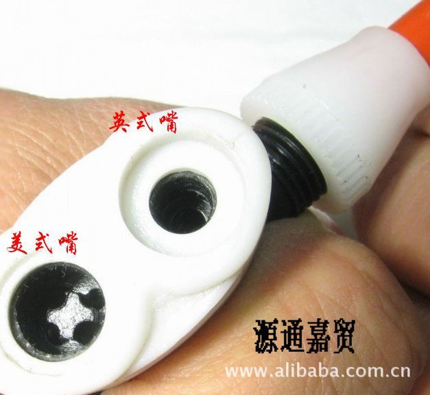 氣嘴切換方法:當您需要使用氣嘴以前,用手指按住您要使用的氣嘴,用力空打幾下,這樣氣流會把氣嘴內的滾珠推向不使用氣嘴這邊堵住氣孔了,這樣就可以打氣了