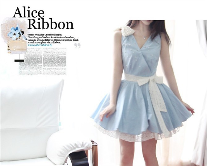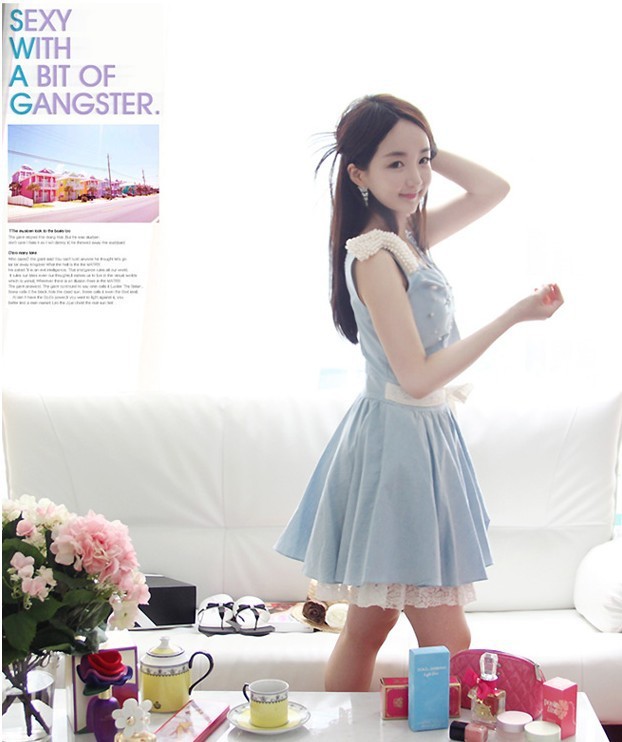 水洗淡藍色牛仔加甜美蕾絲。剛中帶柔小禮服的的版型更是襯托出可愛小女人的氣質。淡藍色的牛仔加上賦予女性蕾絲下擺和珍珠裝飾.浪漫.推薦推薦 肩上蝴蝶結可以拆卸呢