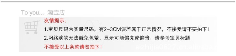 1.本店所有商品均為底價格謝絕還價,同時店內商品都是實物拍攝的,但由于每個人的顯示器不同,顏色會有所偏差,一切以實物為準。買家在收到物品時不能顏色偏差之由調換產品。(如果一定要調換,要保證賣家有貨的情況下可以調換,不能影響賣家第2次銷售,并且要買家付雙程運費)
