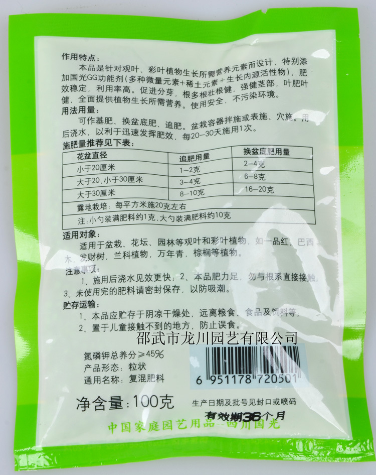本品富含氮、磷、鉀、鈣、銅、鋅、硼等大、中、微量元素,特別添加國光GG功能劑(稀土元素+生長內源活性物),全面提供花卉、苗木、常綠植物、多肉多漿植物、草坪等生長發育所需的多種營養物質。
