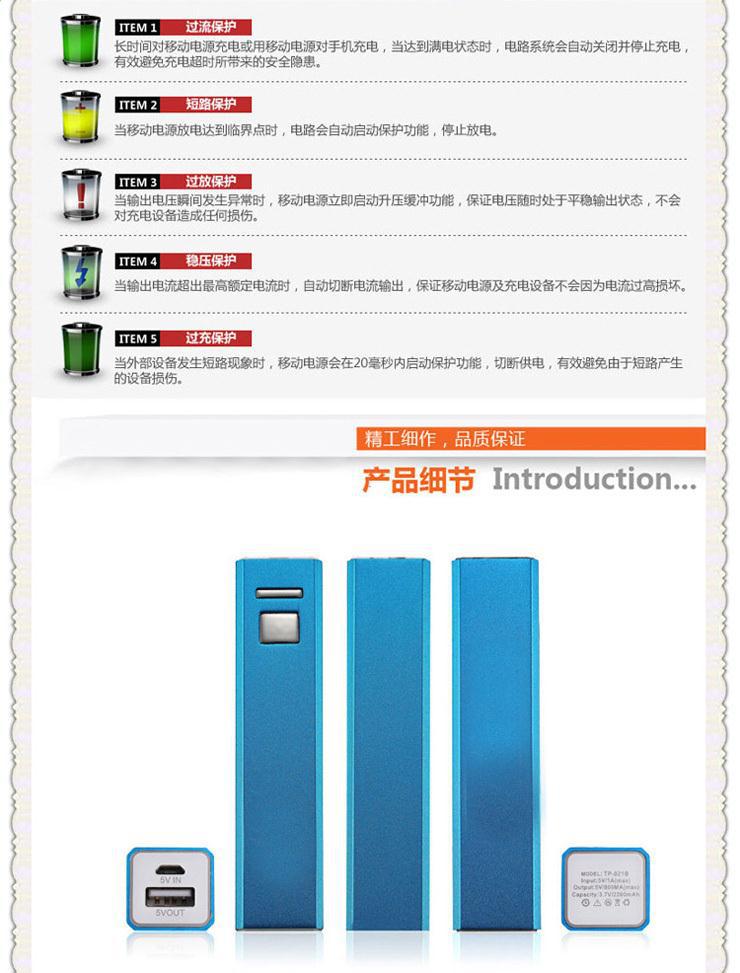 8)即插即用,采用USB端口供電輸出,插上數據線即可實現隨身、隨時充電
