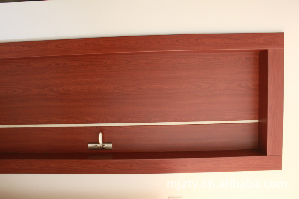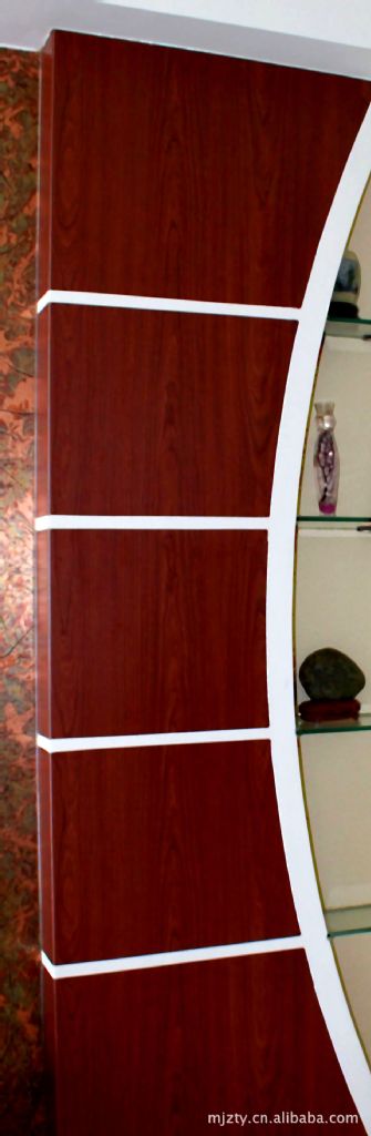 在房屋裝修中,由于本產品裝飾面板具有折角,對于多個角、多個面的所飾物可以連貫一體的直接貼飾在其表面,使被貼表面具有整體性而更美觀,一貼即完成,使木飾的表面貼飾工效提高,更簡捷,不必油漆還避免了污染。