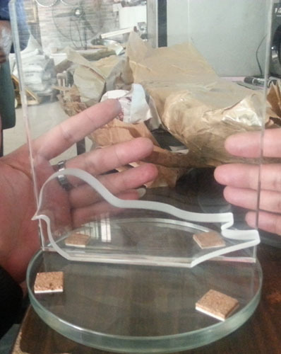 此款玻璃有三個工藝,水刀切割鳥型,再上藥水砂,和背板底板粘連。出口成品。