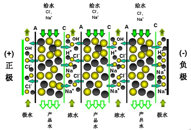 在EDI設備中,進水中的各種離子通過樹脂后被脫除,水得到了純化,此時是利用離子交換原理來脫除水中的離子。由于離子交換膜兩邊加有電壓,水分子被電解為H 和OH-離子去再生樹脂,同時被H 和OH-離子交換下的離子在穩壓穩流電源的作用下,被遷移到濃水室排放,從而實現連續再生連續使用目的。