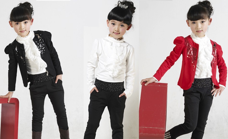 童裝批發】秋裝韓版 秋款時尚亮片女童西裝褲子打底襯衣三件套