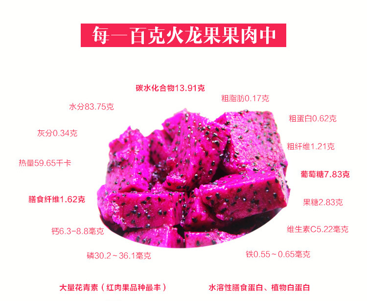 火龍果相當有益健康,其營養價值極高,含有豐富的鈣、磷、鐵…等礦物質和維他命族群,另外有一般植物少有的植物性蛋白、花青素和高量的水溶性膳食纖維。白蛋白是一種具有黏性和膠質性的物質,紅龍果的花、果、莖均屬於質地優良的植物性白蛋白,其對重金屬的污染有解毒的作用,對胃壁也有保護作用?;ㄇ嗨乇谎杆俚奈者M入人體血液後,會運送到各個部位組織,發揮抗氧化、抗自由基和抗衰老的作用,它也能提高對腦細胞病變的預防。抑制老年癡呆癥發生的水溶性膳食纖維,對瘦身減肥的人是極大的福音,更是糖尿病患少數可攝食的水果之一?;瘕埞姆N子內富含不飽和脂肪酸、抗氧化物質及各種等營養素。另外富含天然的色素,是高級口紅和化粧品的名貴材料。而以火龍果飼養的牛,其肉和牛乳可以以較高的價格出售?;瘕埞o上有白色小點的花苞,新鮮莖條絞汁加上蜂蜜飲用,有益健康,而花曬乾後可做料理,或直接沖泡熱水飲用。