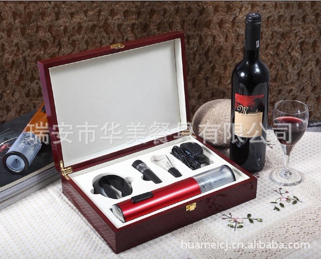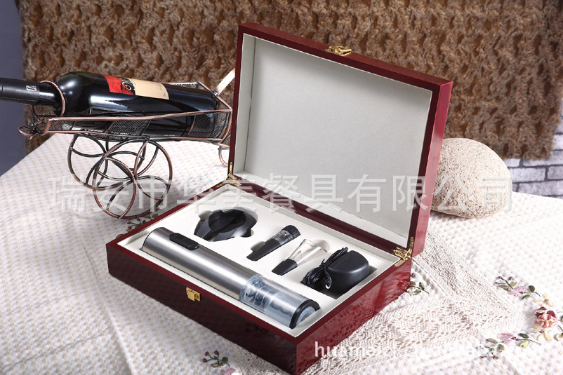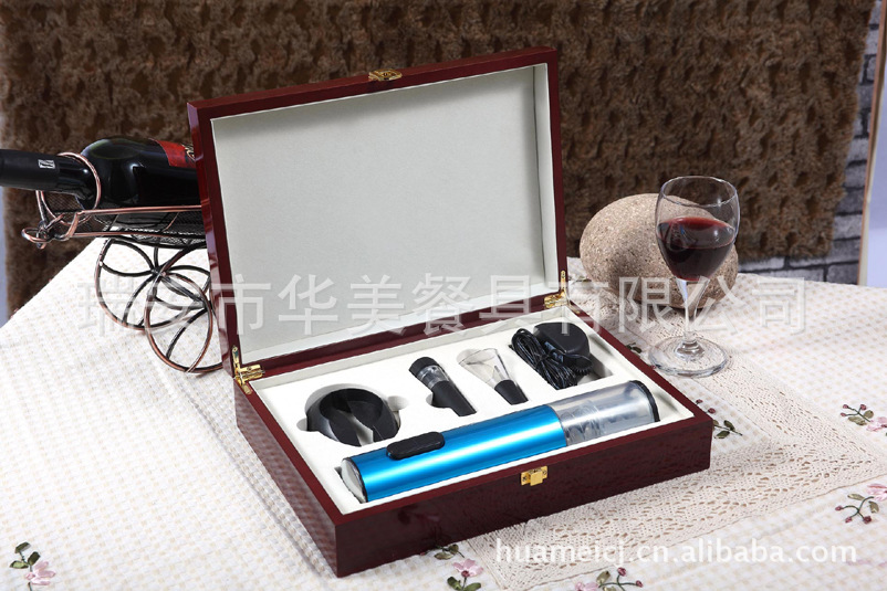 3、充電電動開瓶器套裝配置有充電電動開瓶器、割紙器、真空酒塞、充電器、倒酒器,并配有精美的木皮盒包裝。