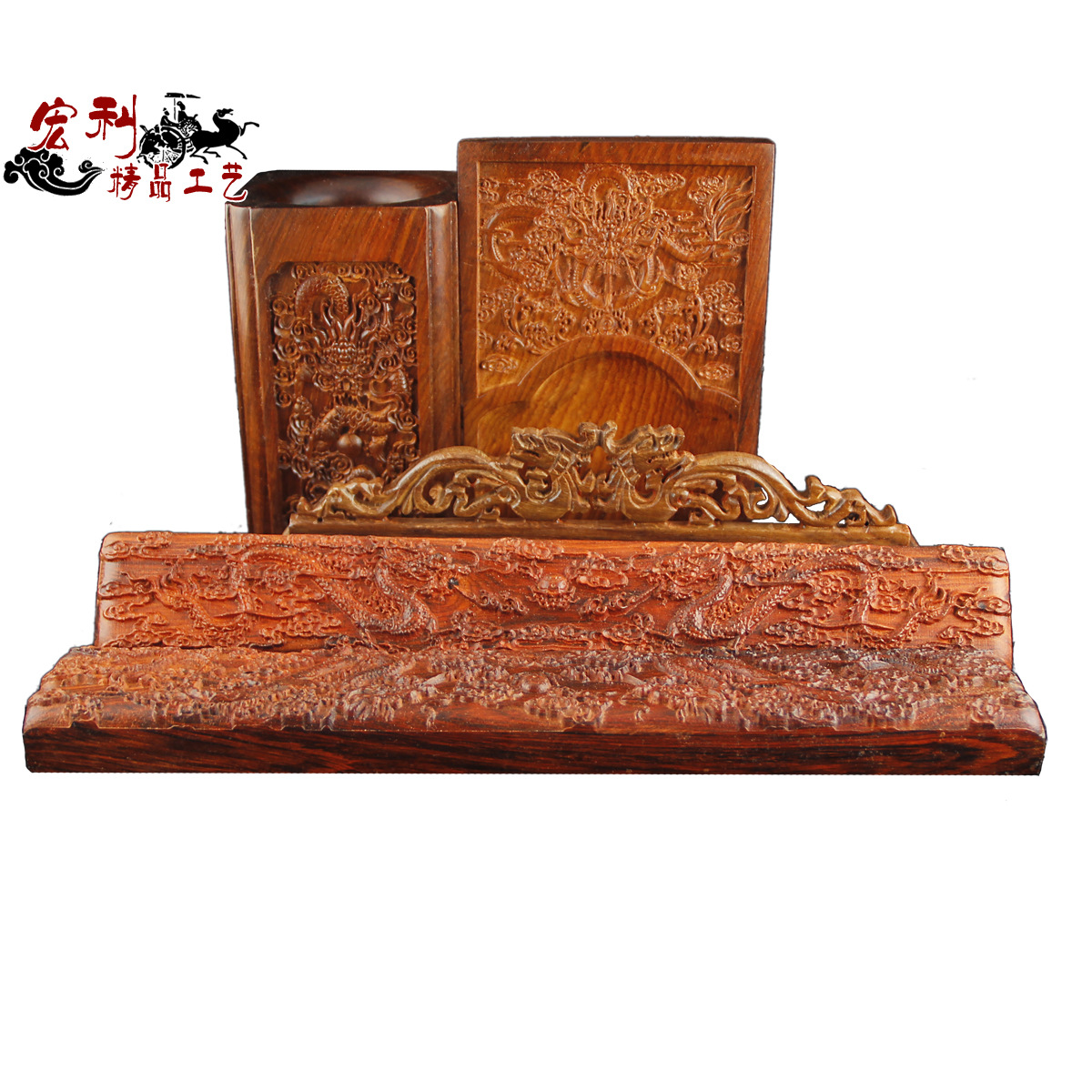 紅酸枝精雕龍文房四寶 紅木雕工藝品 家居禮品文房擺件