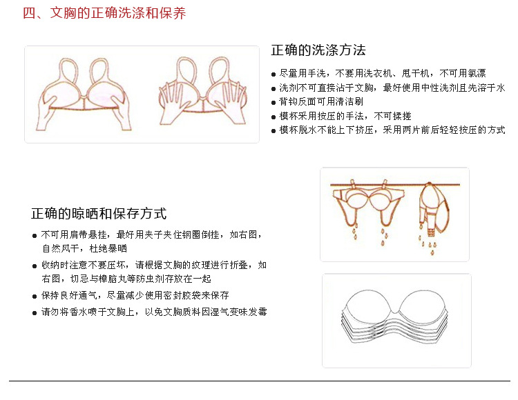 1.洗劑不可直接沾于衣服,應先溶解于水中后再將內衣收入,同時不能用熱水,熱水會讓文胸彈性減弱,強堿性的洗衣粉堿性太強,會讓文胸泛黃,很難看;