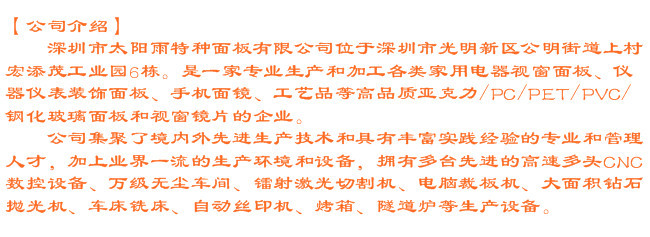主營產品:各類家用電器視窗面板、儀器儀表裝飾面板、手機面鏡、工藝品等高品質亞克力/PET/PC面板和視窗鏡片