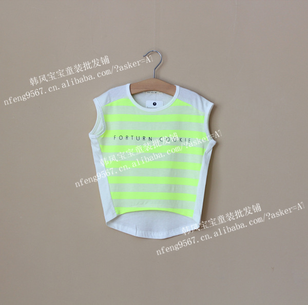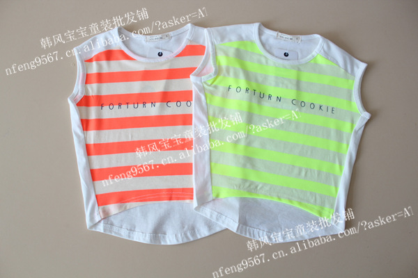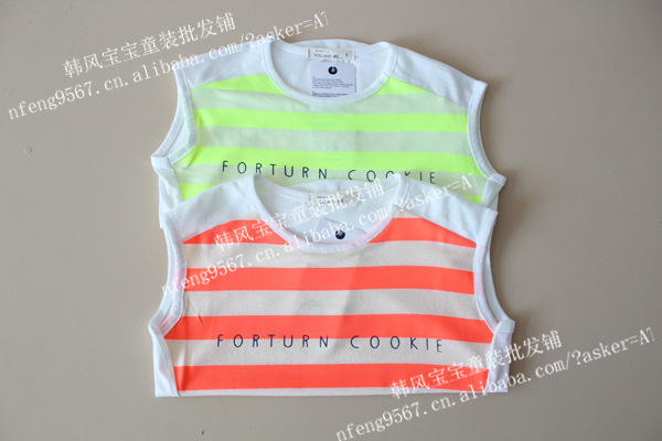 清爽一夏!韓版外貿童裝 熒光色 純棉條紋工字背心 4色