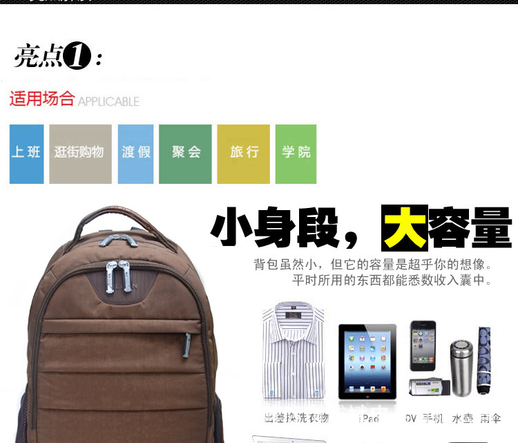 【包包特點】舒適的流水曲線型肩帶,能有效的起到防滑落的作用。厚軟的海綿結構能有效的緩沖外力對肩部,腰部,尾椎部的壓迫,無論您是出差,旅行,還是日常背帶電腦或其他物件,都能很好的保護您的身體及物件不受損傷。肩帶與包身的寬面積自然縫合,完全解決的普通背包肩帶縫合處易于開裂的弊端。