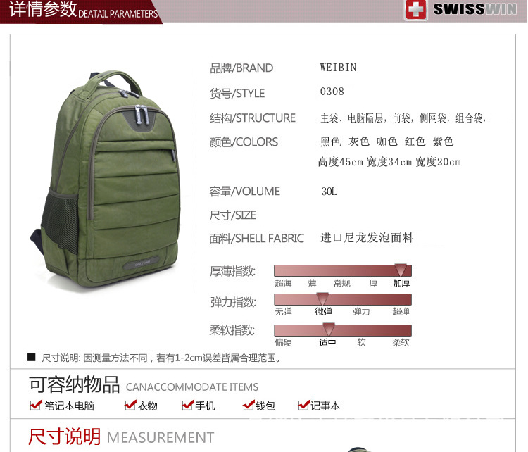 采用尼龍面料,具有防水功能,極其富有質感,做工精致,每一個細節都體現了威斌的不凡魅力。豪華精致的做工與設計搭配富有品位的您,適合任何場合。威斌箱包極盡奢華之設計,顯示您尊榮華貴的象征,體現與眾不同的氣質!讓您脫穎而出,備受注目!此包包人性化,多功能設計,讓您帶著輕松愉快的心情工作休閑!
