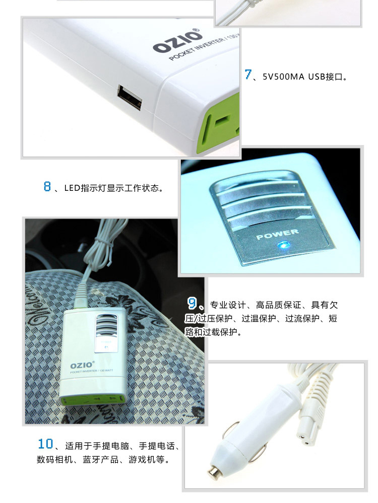 OZIO奧舒爾自主設計與研發的汽車電源產品有:車載電源逆變器、車載充電器、車載點煙器、汽車應急電源、汽車冰箱等產品。產品擁有十多個專利項目。