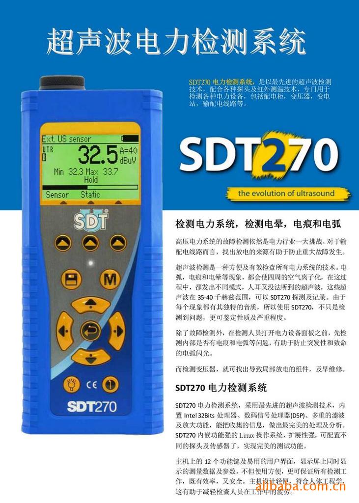 SDT270電力檢測系統,采用的超聲波檢測技術,內置Intel 32 Bits處理器、數碼信號處理器(DSP)、多重的小小及放大功能,能把收集的信息,做出完美的處理及分析。SDT270內嵌功能強大的Linux操作系統,擴展性強,可配置不同的探頭及傳感器,實現完美的測試功能。