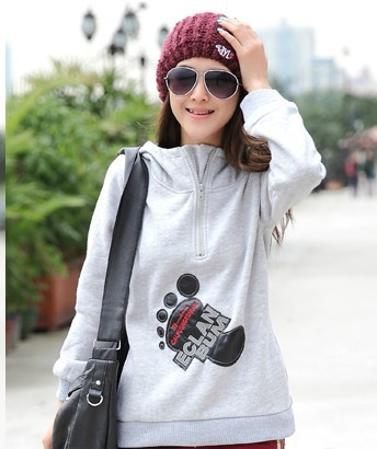 現在的天氣是一天比一天冷,不過這阻擋不了愛美女人追求美麗的心哦!內抓絨的衛衣套裝,雖然仍很單薄,但在美女們的經典混搭中,配上了棉馬甲,還混搭上了厚厚的雪地靴,不僅讓女人的冬天更溫暖,還多了幾分特有的時尚!加厚的面料,內為抓絨填充,保暖時尚,連帽的設計加上靚麗的顏色洋溢著青春的朝氣,讓你充滿了無限的活力,帽內采用的是皮質的設計,跟胸前可愛的貼布腳印圖案相對應,領下豎拉鏈的加入讓YY更加率性!