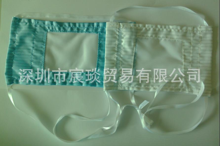 防靜電口罩由專用滌綸長絲與高性能性導電纖維經特殊工藝織造而成,用此種面料經特殊縫紉工藝制成的防靜電口罩具有優良持久的防靜電防塵性能,能有效地釋放人體靜電電荷。潔凈綢織物密度要大于普通絲綢織物、達到不起毛、不起球、不脫落纖維、不起塵、不透塵、氣密性好,能有效殺菌、抑菌;另此種防靜電布料為雙重性能:性防靜電及防塵效果特好,能用于100-10000級無塵室,達到國際標準。