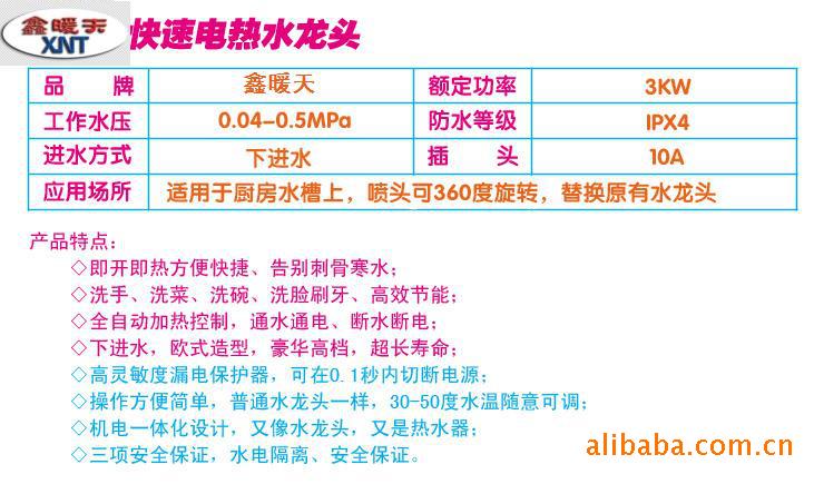 五、鑫暖天電熱水龍頭優點是:省水,省電,省空間,使用方便,高效,一年365天不管什么時候想用熱水就有熱水,溫度30-60度可無極調溫(與水量成反比),冷熱水雙用,一個水龍頭當二個用,無需預熱,無需保溫,即開即熱。