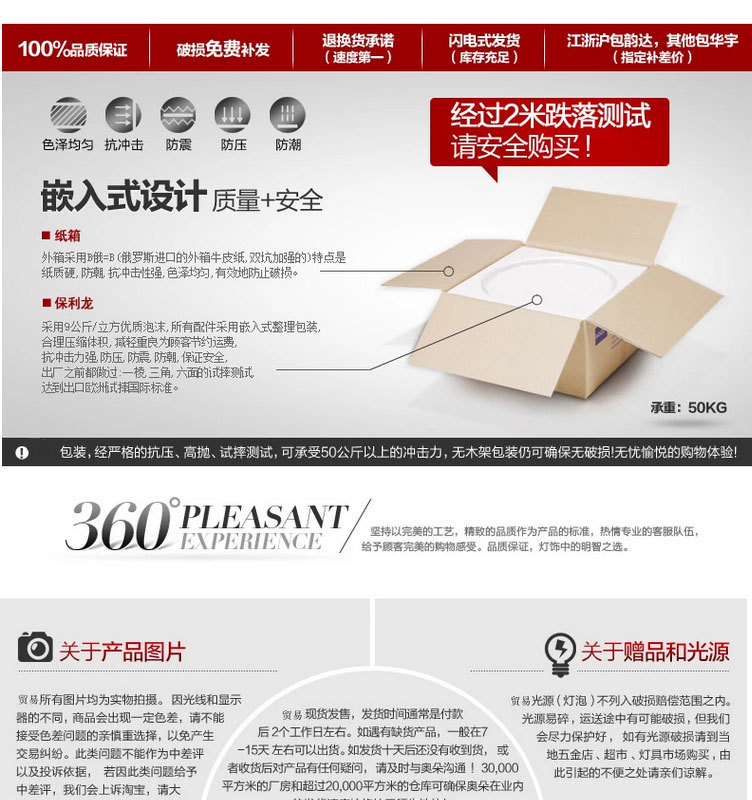 本公司所售燈具均不含光源。發貨時間現貨1~3天,無現貨須訂做的要15天左右,拍前向客服咨詢。本公司阿里巴巴網頁上的標價均不含運費! 本公司發貨只發快遞或物流,不發平郵。大件物品發物流,物流需要您帶著收貨人身份證去物流公司指定物流點提貨。物流運費一般到付!我們一般默認浩辰物流,入不到的可以換別家的,您也可以自己選擇物流公司。如需快遞,請和我們聯系確認運費后,和貨款一并支付。本公司所出售的燈具均不含光源。發貨時間一般現貨1-3天,無現貨訂做須15天拍前向客服咨詢。