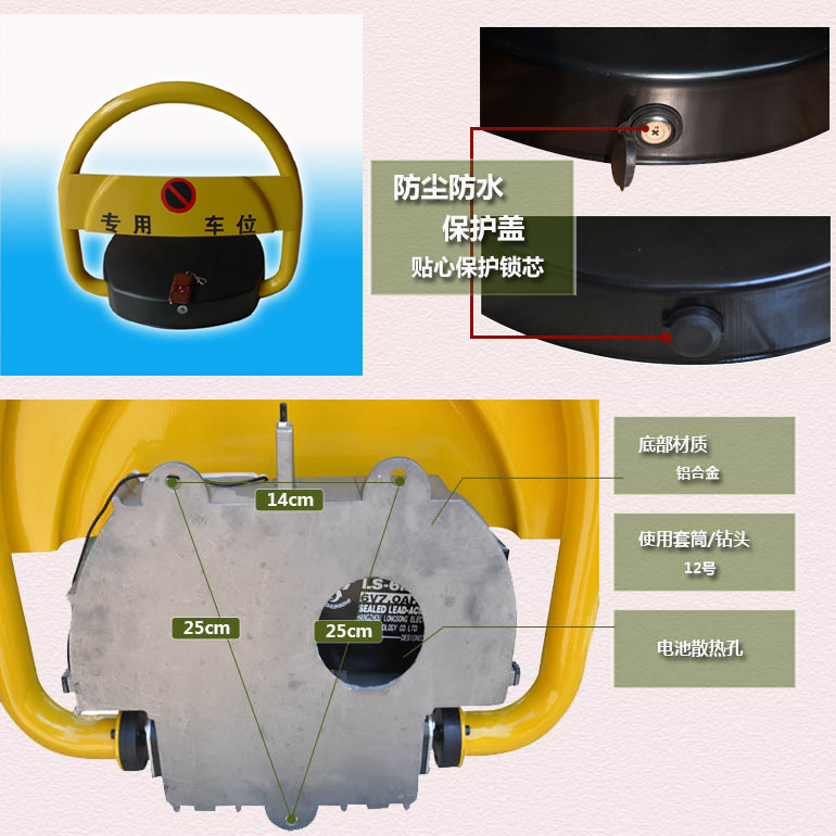 當車輛將要到達車位時,由車主使用遙控器控制車位鎖,使車位鎖下降到底,車輛便可駛入,車輛駛入車位后,車主按一下遙控器的上升鍵,車位鎖自動升起到保護狀態.當車輛離開時,由車主使用遙控器,按遙控器下降鍵,讓車位鎖下降到位,汽車駛出車位后,車主只需按動遙控器的上升鍵,車位鎖就可以自動上升到保護狀態了.能防其它車輛占用車位。
