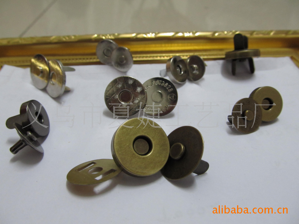 你好,我廠專業生產各種磁扣,磁按扣,厚的直徑1.0CM 1.4CM 1.5CM 1.8CM ,超溥直徑:1.0 CM 1.2 CM 1.4CM 1.8CM,電鍍各種顏色等等,常規規格我司倉庫備有大量現貨,以及各種規格的各種類型相框配件/家具配件/五金配件等,產品有:合頁、螺絲、角花、銅掛、包角、吊掛、角釘、片釘、直釘、帽釘、掛勾、 箱包包角,鎖扣,壓片,撥片,擋片;金屬彈片,瓜子片,月亮片; 掛片,三角掛鉤,掛鉤,葫蘆片;背扣,,相框合頁、雞眼,空心鉚釘,鉚釘,單面撞釘,雙面撞釘;角碼;五金拉手,箱包拉手,五金曲手,合頁鉸鏈,鐵合頁,小合頁,七字合頁,三叉合頁,