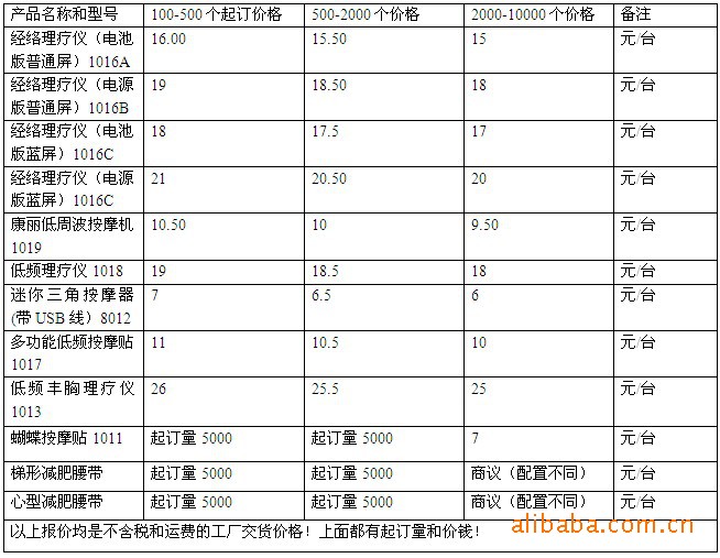 產品功能: 微電腦減肥瘦身腰帶擁有6種不同震蕩模式,10檔強度,讓脂肪相互撞擊,從而分解多余的脂肪,適合不同的人群需求 擁有碎脂機,從此減肥不用上健身房,不用節食. 能讓你在上班,購物,看電視,做家務...任何時間,任何地點都能使用. 不僅小腹,連大腿,手臂,臀部任何一處肥胖的部位都能使用.想瘦哪里就瘦哪里!整套產品包含: ①一個控制器 ;②一條束帶 ;③兩條可伸縮的綁帶 ;④兩粒電池;⑤100mL按[mo]油1瓶 。使用一粒CR2032鋰電池,產品操作非常簡便,只有三個控制鍵進行操作,而且程序會自動運行,當您選擇好鍛煉部位,打開電源,調節好強度后程序自動運行12分鐘,12分鐘后自動停止,如果您想繼續進行,請重新開啟。注意使用時必須貼著皮膚使用,而且使用時涂上按[mo]油效果更佳, 使用后一、兩分鐘內,可能會有不同程度的不適反應(如癢、麻、多汗)等感受,均屬正常反應。 1. 微電腦減肥瘦身腰帶有6種不同震蕩模式,讓脂肪相互撞擊,從而分解多余的脂肪; 2. 肌肉鍛煉單元工作時產生電脈沖; 3. 產品操作非常簡便,只有三個控制鍵進行操作而且程序會自動運行; 4. 注意使用時必須粘著皮膚,涂上瘦身精華素效果更佳,使用后一、二分鐘內,可能會有不同程度的不適反應(如癢、麻、多汗)等感覺,均屬正常反應。 技術參數: 外箱尺寸: 58.5*46.5*53cm 裝箱數量:80PCS