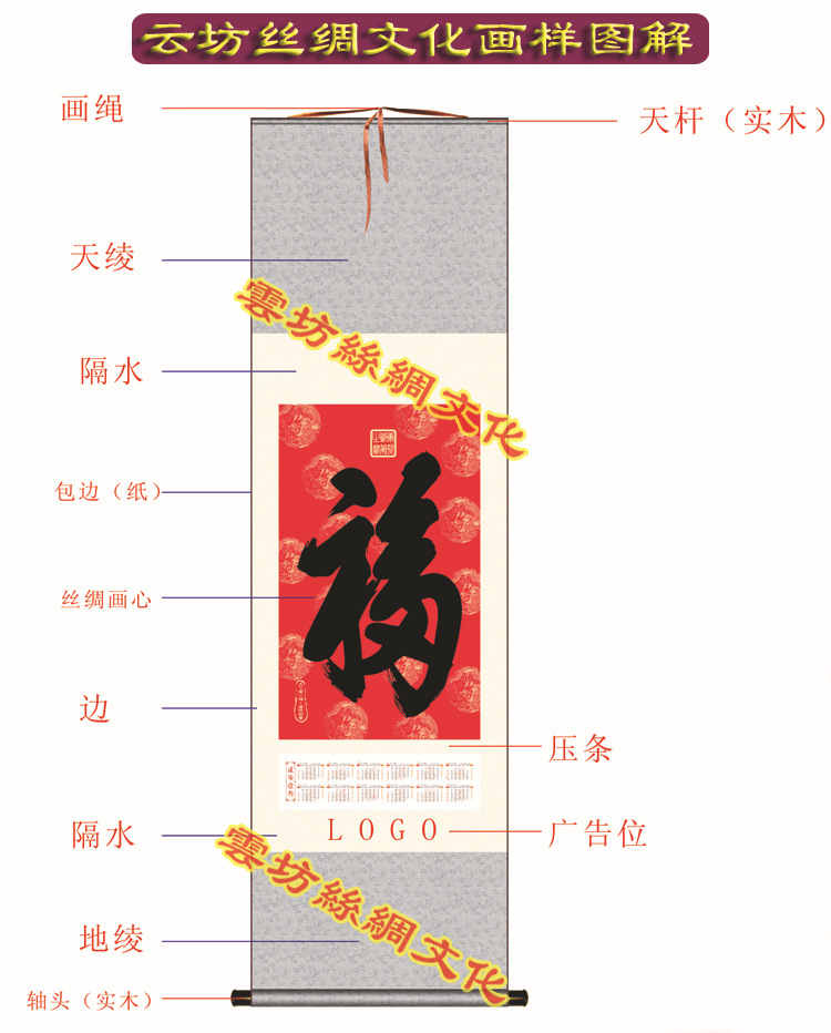 為了傳承絲綢之路的東方文明,展現中華五千年絲綢的魅力與繁華,公司率先 引進國際領先的絲綢彩圖高清晰度印制技術,它的畫面清晰、色彩鮮艷、絲絹光澤亮麗動人;將現代數碼 技術和傳統絲綢工藝相結合,以絲綢為材質,以中國書畫和字畫為表現形式,開發出的真彩絲綢畫產品, 選用真絲花綾對其進行裝裱后,該產品更加典雅、莊重、華貴。具有畫面平整、線條流暢、工藝精湛、不生霉、不變色、不蟲蛀、不變形、可洗滌等特點,已成為有中華五千年文化內涵的藝術禮品。受到了 各地政府、企事業單位和個人的青睞,成為招商引資、文化交流、商務洽談、各類慶典的禮品。深受國內外廣大客戶的青 睞,產品銷往世界各地.相信云坊在絲綢文化的道路上越走越遠! 除常規產品外,還可根據不同的客戶要 求定做各類不同規格和不同類型的個性化特色產品。