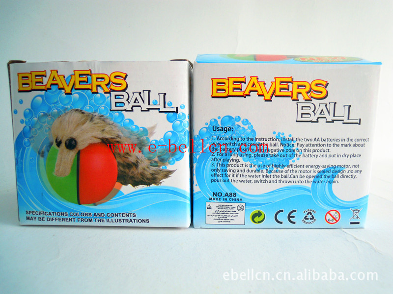 樣品編號:EB-A88品名:電動海貍球(水耗子)包裝:彩盒裝箱量:144 /2PCS樣品規格:28.0*8.0*7.0 cm外箱規格:69*36*68cm體積: 0.169cbm毛\凈重:22.8/19.8 KGS備注:適合水里玩;材料:ABS;顏色:藍紅/綠紅;球尺寸:8*8cm,海貍尺寸:21*6cm,彩盒尺寸:11*8*10cm