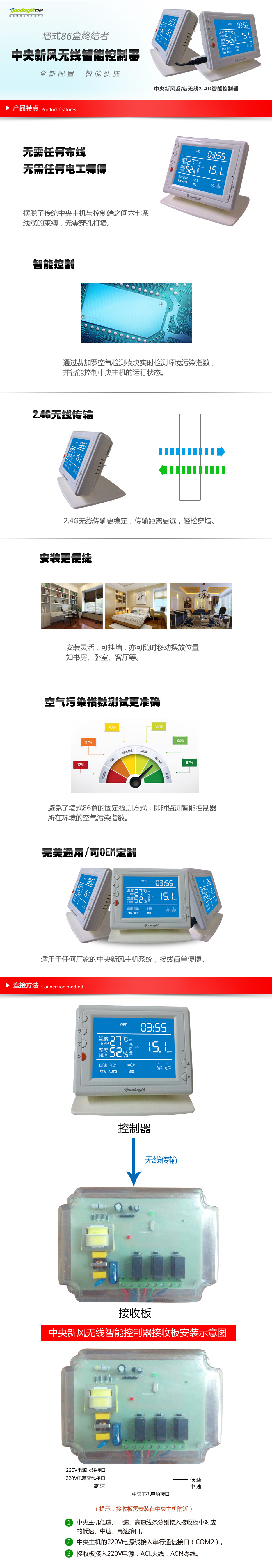 告別布線困難,操作繁雜的傳統墻式86盒,2.4G無線傳輸更快更穩定,無需布線無需電工師傅??刂破骺呻S心擺放,配備實時空氣質量檢測模塊,可智能調節中央主機運行狀態,開創中央新風系統先河。