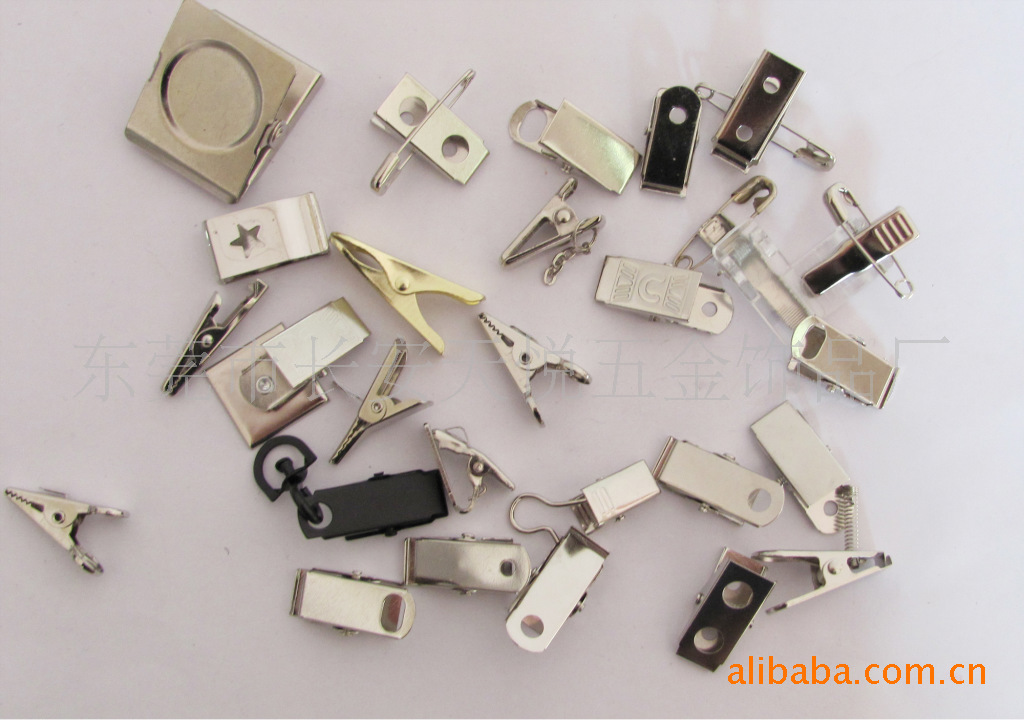 該為夾子類產品。材質可分為鐵、不銹鋼、銅片材以及合金等。片材采用沖壓工藝成型,表面可壓制或蝕刻各種LOGO圖案,也可印刷各式彩色LOGO。合金材質的則采用鑄造成型,產品上面同樣可以直接鑄出LOGO,也可以采用雕刻或印刷等工藝制作。表面可電鍍成各種顏色?,F有多種款式的夾子可供客人挑選,同時也可以按照客人的圖紙或樣板進行開模生產。由于鐵材質電鍍較容易變色和生銹,夾子材質可改為銅或不銹鋼。使用時盡量避免直接與酸、堿液接觸,以增長使用時間。歡迎各位新老客戶垂詢定購。