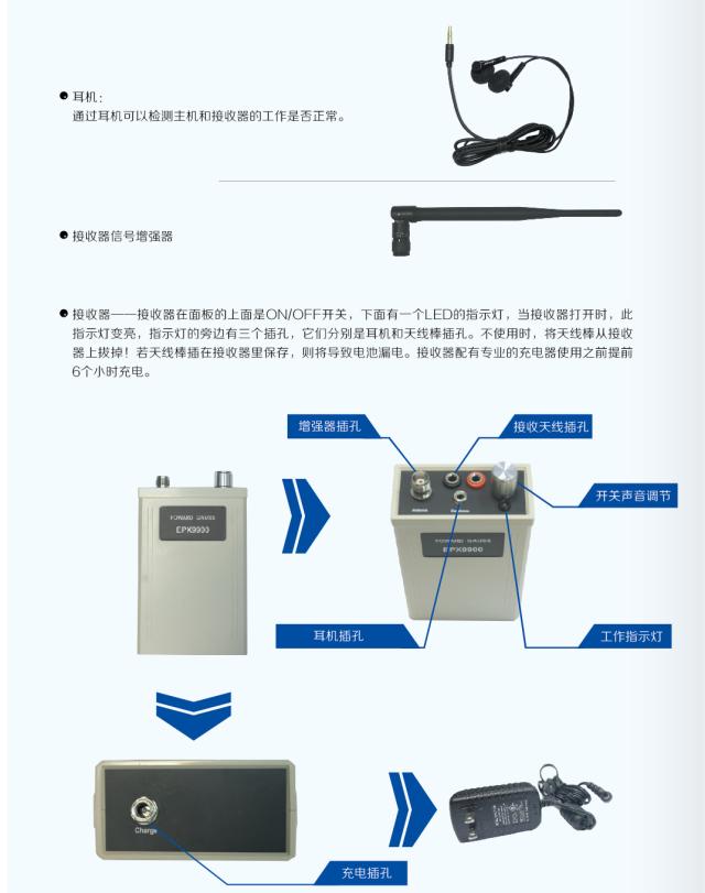 接收器:接收器在面板的上面是ON/OFF開關,下面有一個LED的指示燈,當接收器打開時,此指示燈變亮,指示燈的旁邊有三個插孔,它們分別是耳機和天線棒插孔。不使用時,將天線棒從接收器上拔掉!若天線棒插在接收器里保存,則將導致電池漏電。接收器配有專業的充電器使用之前提前6個小時充電。