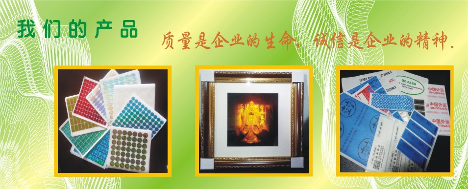 主營產品:3D全息圖標簽;數碼查詢防偽標簽;刮開查詢防偽標志;3D光柵片立體畫;揭開式數碼查詢標;燙印全息標簽;800電碼查詢防偽標;漏空洗鋁防偽標;全息圖不干膠標簽;封口防偽標簽;水印纖維紙防偽印刷;UV熒光隱形防偽商標;凹凸版紋字防偽標簽;安全線防偽紙;激光鐳射標志;VOID揭開留字防偽標;纖維絲熒光防偽標識;合格證不干膠標簽;鐳射易碎貼紙;全息激光鐳射貼紙