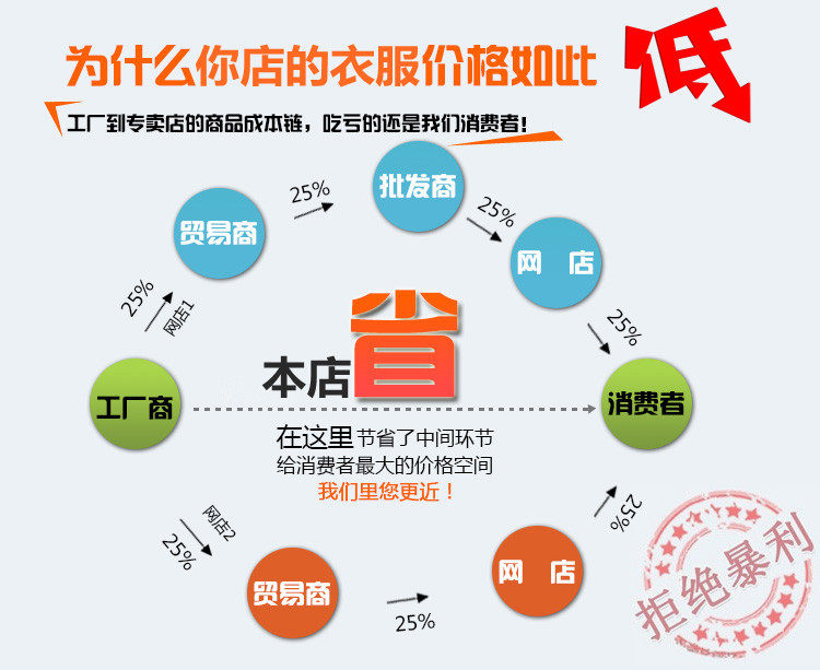 聯系客服請采用旺旺方式聯系,認 準同一個客 服咨詢,可以得到更***服務!由于咨詢量很大,旺旺通常處于爆掉狀態,如果長時間 未得到回復,可以根據描述說明選擇自助購物,所需要的顏色/尺碼/快遞信息 請直接填寫在備注說 明里。有特殊需求可以留言,我們會一一處理氣味問題衣服直接從工廠發出,生 產出來馬上 包裝,難免有些氣味,這屬于正?,F象。建議敞放幾天,氣味自然會消失。如對氣味較 敏感,請慎重考慮后購買。氣味問題不作為退換貨依據尺寸問題為方便親們選購,我們提 供了尺碼對 照表、測量方法。然而因每個人的體型不同,個體感受也有差異,對于尺碼我們只提供 建議,具體尺碼選擇請根據個人體形的實際情況來選購。如因尺碼不合適退款 ,需要由買家自行承 擔來回郵費色差問題我店商品照片均為***攝 影師拍攝, 盡量與實物保持一致,但由于拍攝技術/環境光線/顯示器色差等原因,可能導致圖片與 實物有略有色差,請終請以實物的顏色為準關于發貨關于發貨,如無特殊原因 ,已支付訂 單我們會在24小時內發出(為方便顧客能夠順利收到寶貝,請在拍下付款后留言處備注 所需發的快遞公司),另偏遠地區包括新疆、內蒙古、西藏、青海、寧夏及發 EMS、順豐快遞需補 運費差價,有特殊要求請告知客服或在留言處留言說明