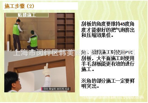 裝飾膜是進入中國市場的高科技新型裝飾材料。不含有任何有害于人體的成分。利用壓延機設備及第二次加工設備而生產的新型環保產品,利用尖端的印刷技術及特殊的制作工藝,在特殊加工的膠片上開發出多種款式的紋理和表面具有凹凸和立體感的很多種類,與原來的收尾材料相比,擁有多種款式,包括自然質感的木紋系列,高品質感的金屬系列,立體感很強的皮系列,還有顯大氣的大理石系列,是按照消費者要求的氣氛和用途,可以選擇適當款式的裝飾施工收尾材料。而且, 經特殊剪貼處理,在平面及至曲面上的施工變得簡易,與其它收尾材料相比,既經濟又易于施工。他對于碰撞, 摩擦,涂料等的耐久顯著以及防潮, 耐熱,易除污垢等效果顯著,主要用于高場所的的收尾處理,如禮堂 飯店 賣場 百貨商場 賓館 辦公室 機場 公寓 別墅 電梯口 劇院 可貼于鞋柜 書柜 衣柜 書桌 板材 玻璃等等一切表面平滑的基材上 用于衣柜書柜等家具翻新,可瞬間將家具煥然一新。LG和韓華pvc裝飾膜在國內獲得了消防防火認證,因此不需要做其他防火處理。