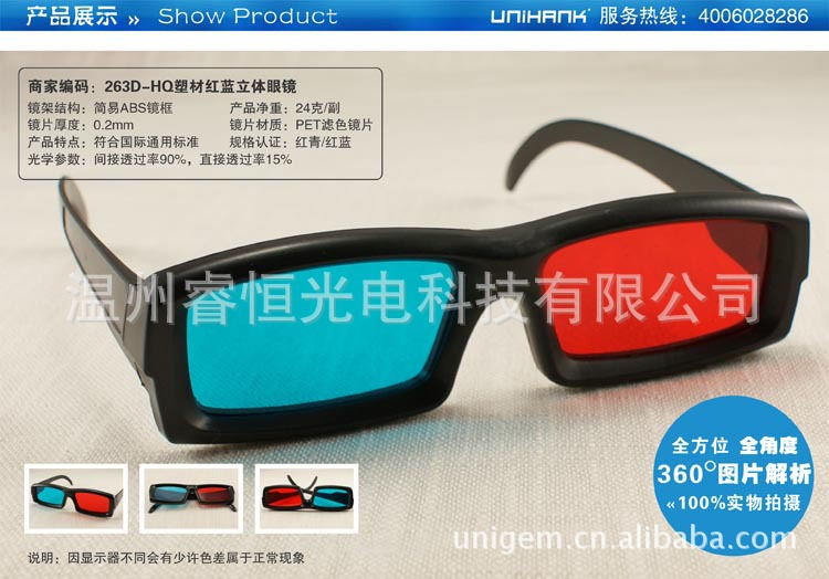 紅藍立體眼鏡產品其他參數:光學參數:間接透過率90%,直接透過率15%。