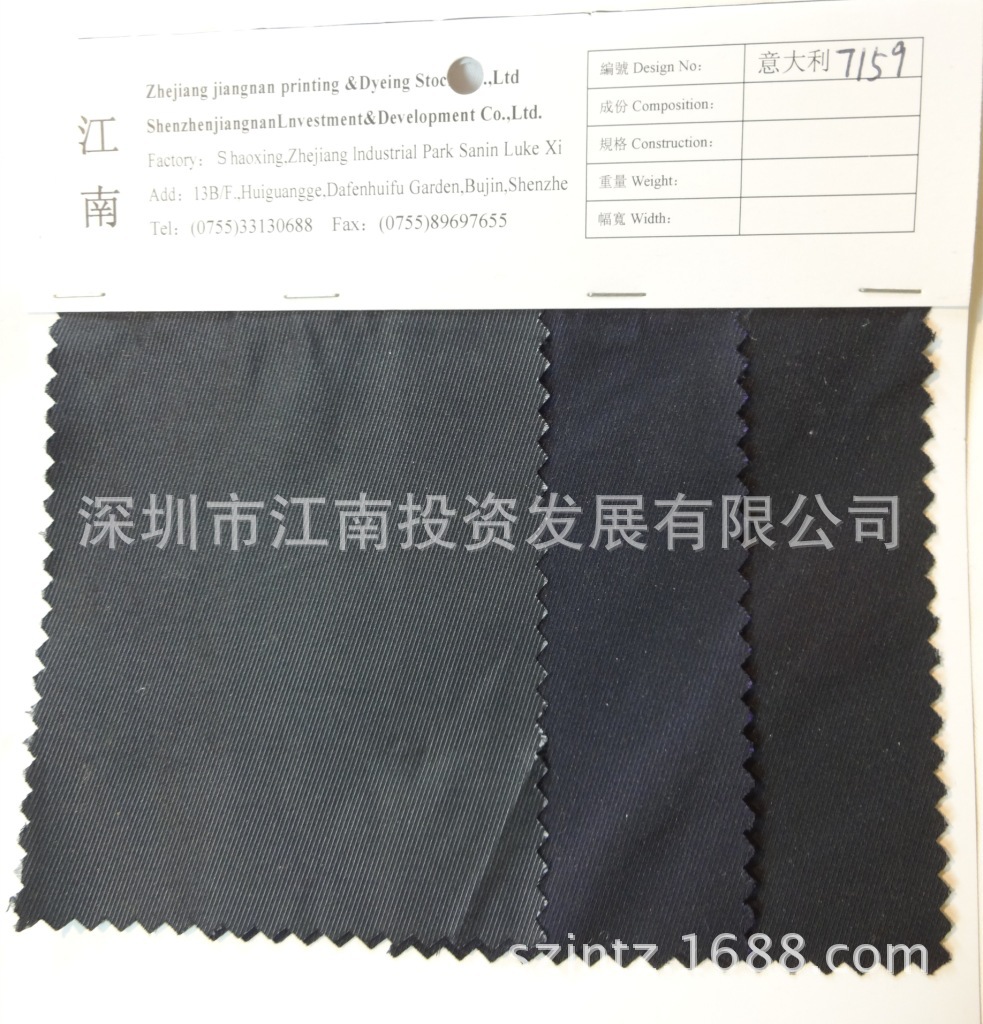 深圳江南投資發展有限公司是一家集漂、染、印、整于一體的工貿結合型現代化紡織面料生產加工企業,公司總部座落在全球的紡織品集散中心——中國輕紡城柯西工業園區,分公司江南投資發展有限公司位于深圳布吉大芬,毗鄰羅湖區,交通便利,歡迎各界客戶來公司洽談。公司占地面積10萬平方米,總投資1.8億元人民幣。引進奧地利圓網印花機、德國寇司德連續軋染機、德國西特瑪磨毛機、德國雷密許軋光機和韓國定型機等國際先進設備。本公司設五大車間,擁有10條一流的染色、印花生產流水線及軋光、防縮、免燙、防蟲、磨毛等特殊后整理設備,年生產加工能力8000萬米,年產值達2.5億元人民幣,實現利稅2500萬元。公司廣納賢才,匯聚各路精英,擁有一大批高級職稱的管理人才和專業技術人員,共有員工600余人,公司將以一流的技術、一流的設備、一流的管理,創就一流的產品。主要產品系列有30×68棉布系列,90×88棉布系列,錦棉系列,棉麻系列,棉斜系列, 彈力夫綢,雪紡面料,燈芯絨系列,帆布系列,貢緞系列,迷彩系列,棉夫綢,造棉,紗卡系列,剪花布??筛鶕蛻粢?ldquo;量身訂做”, 歡迎定制各類布料。