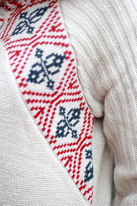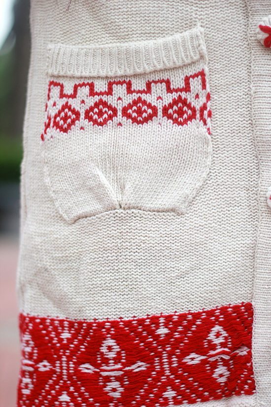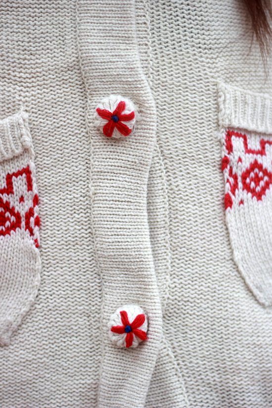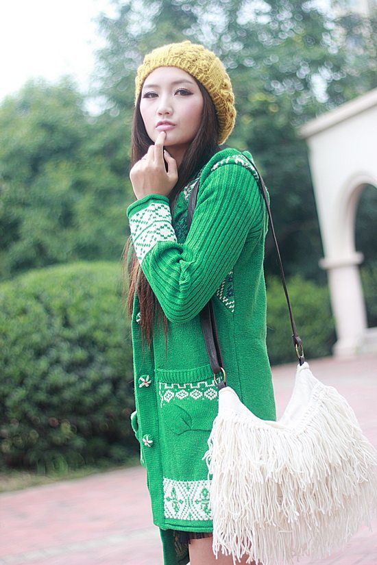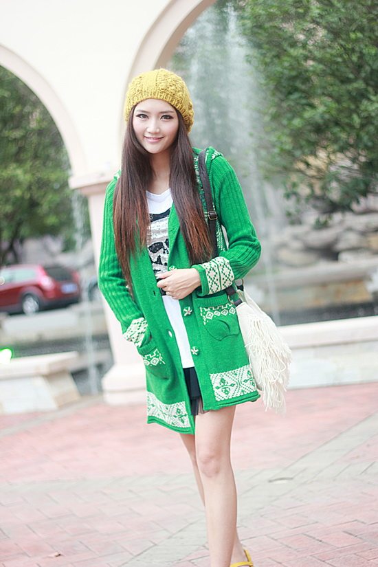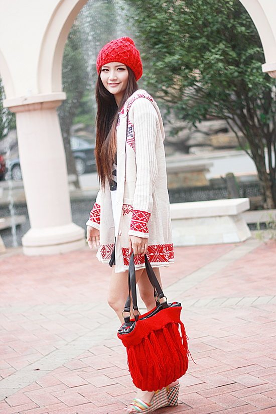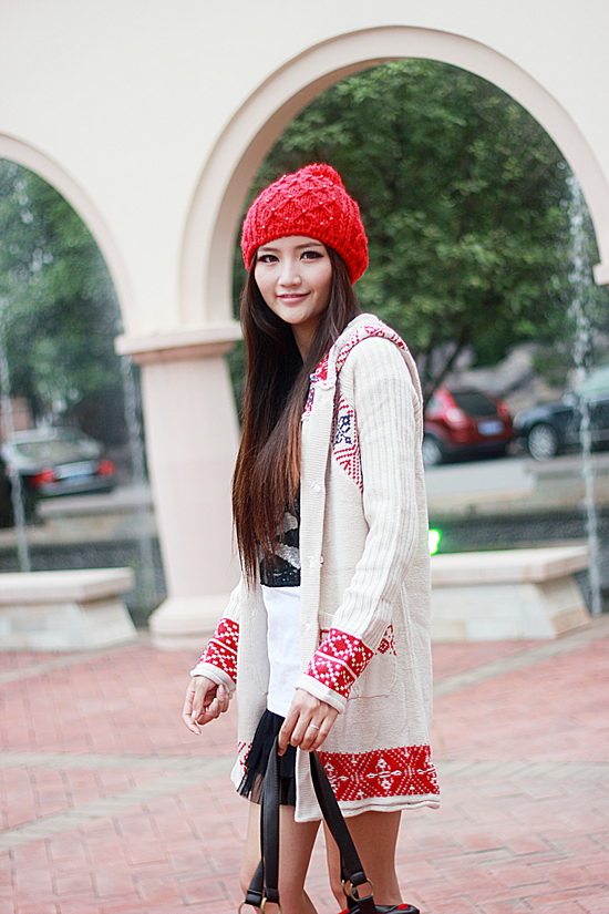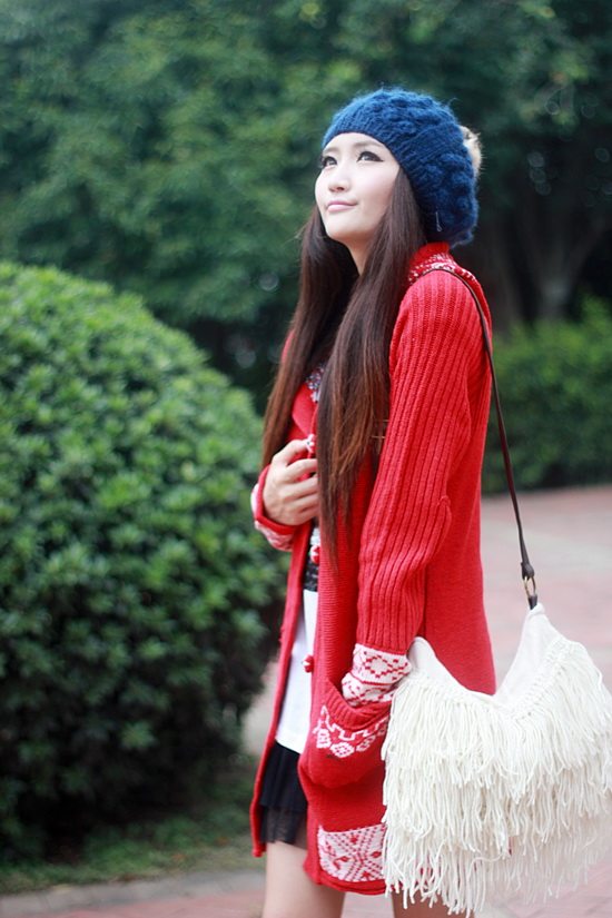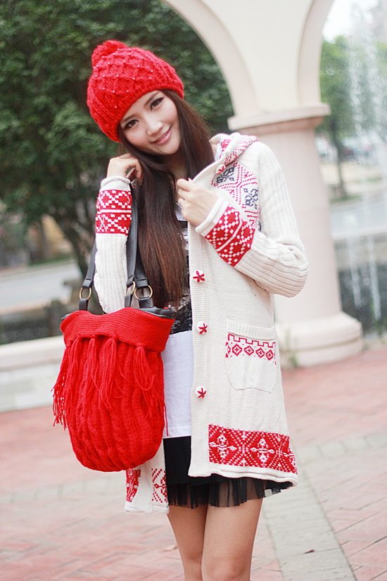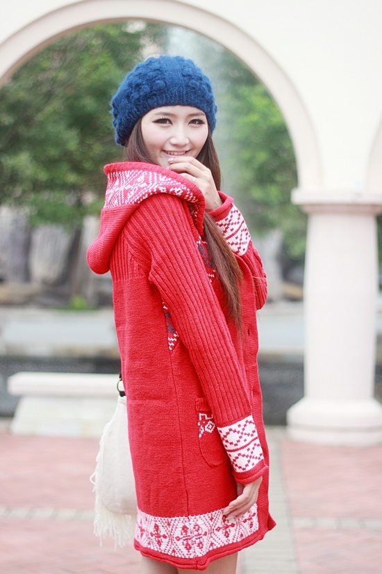 以白色為主色調看起來比較清新,再配以紅色的伊斯蘭風格的花紋,清新中顯出高雅的氣質。后面的小帽帽給人舒適安寧的感覺,俏皮的紐扣仿佛點點繁星點綴在潔白的大地上。整體長版的設計使身材顯的更加的修長簡約中透著可愛。衣袖采用了豎線條的紋路,使得手臂在視覺上有拉長和顯瘦的效果哦。值得一提的是,此款YY袖子還可以當手套使用的。細節圖稍后補上!