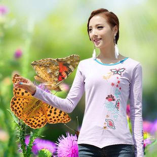 廠家直銷新款品質民族風長袖T恤彈力純棉繡花女式打底衫特價 促銷