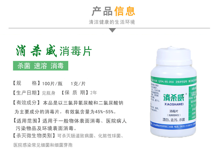 本品是以三氯異氰尿酸和二氯異氰尿酸鈉為主要成分的消毒片,有效氯含量為45%-55%。