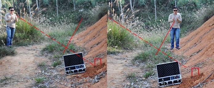 8. 重復第六步。當你接近發射天線和測試物這條線的時候,接收天線應該是交叉的。(記?。簻y試物和發射天線之間的信號線將會形成,而不是測試物和 發she器之間 的信號線)。當你走過這條線的時候,接收天線將不會交叉。在天線交叉處做下標記?,F在,再遠離發she器一些距離(如果一。開始距離發she器5到6米,則應到8 米處)。重復上述過程:在接收天線交叉處做下標記。然后通過發she器和做標記的兩個地方畫一條線,這就是你確定的X軸。關掉發she器和接受器,然后等15分 鐘,把發射天線和發she器挪到一個新的地方,重復這一過程。記住要把發射天線埋進去。這次你確定了Y軸,X軸和Y軸的交叉處即目標物所在地。